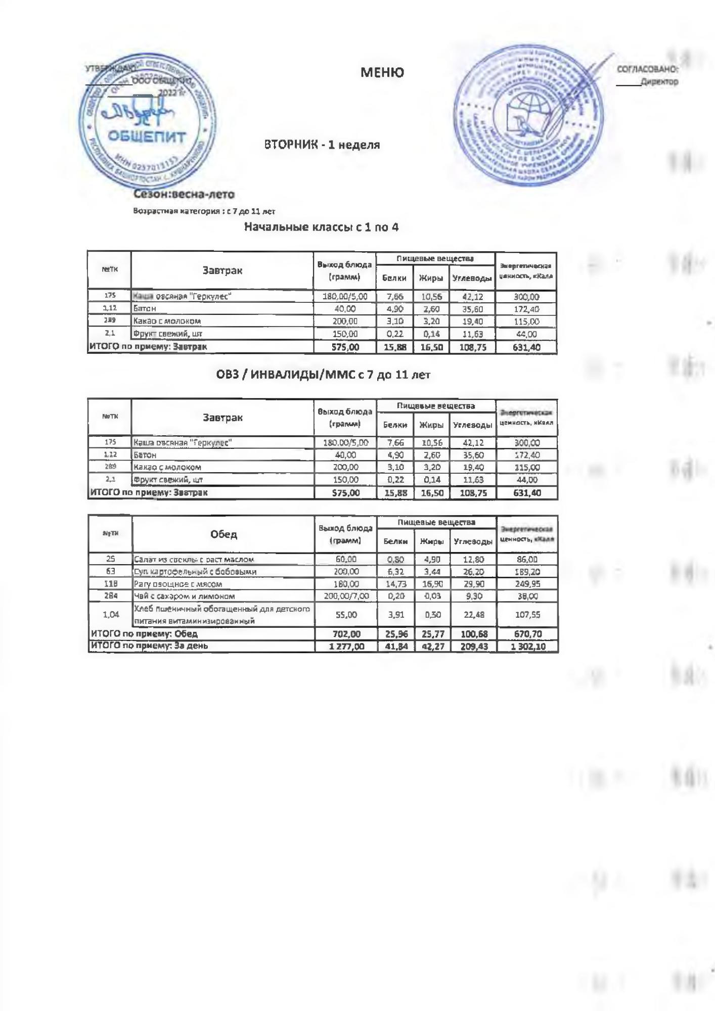 Двухнедельное меню за 2022-2023 учебный год(осень-зима)