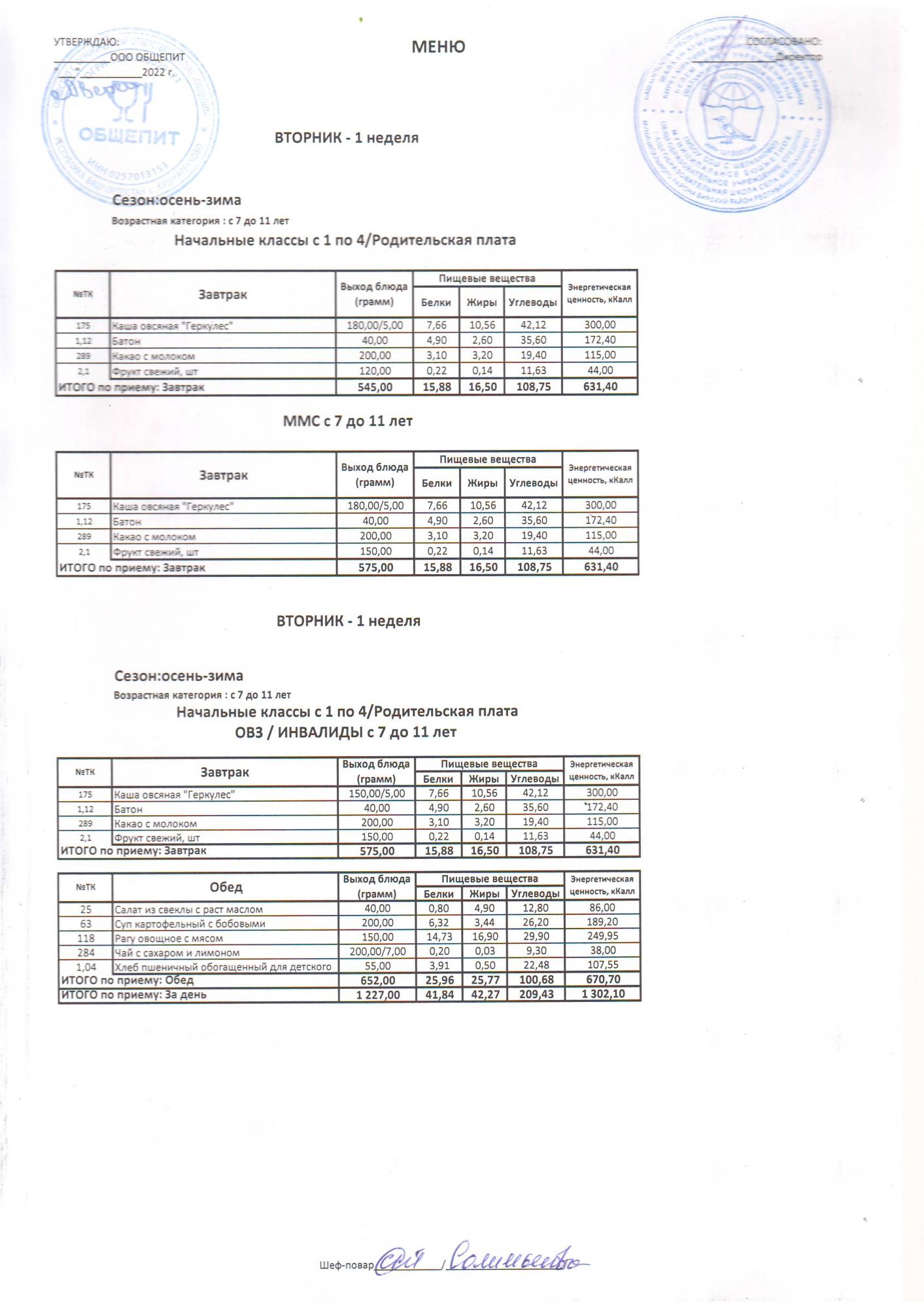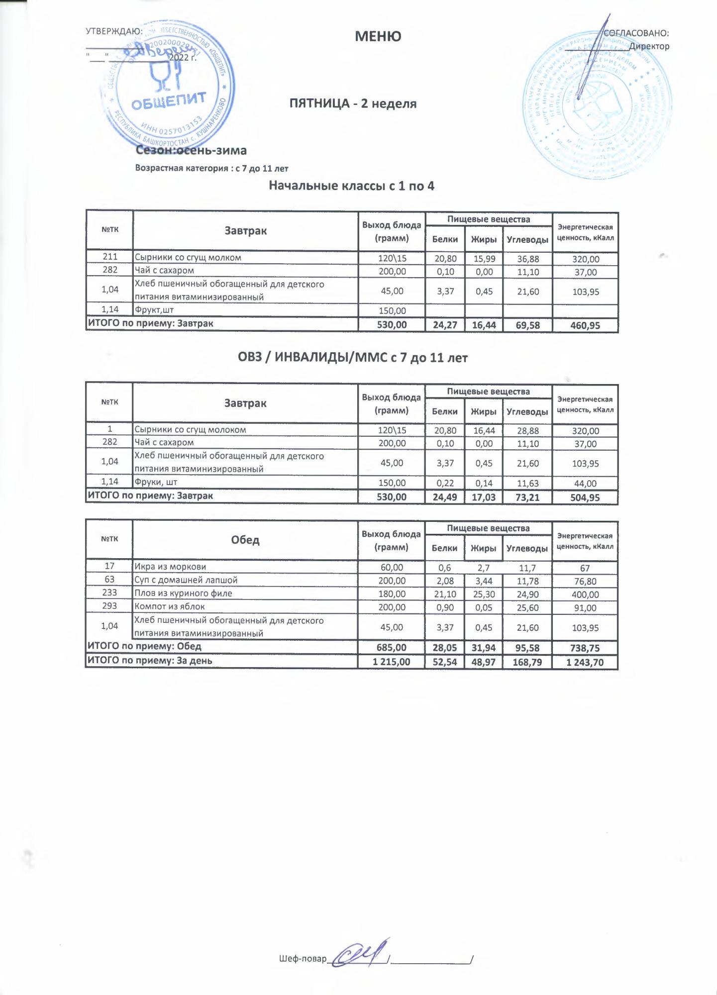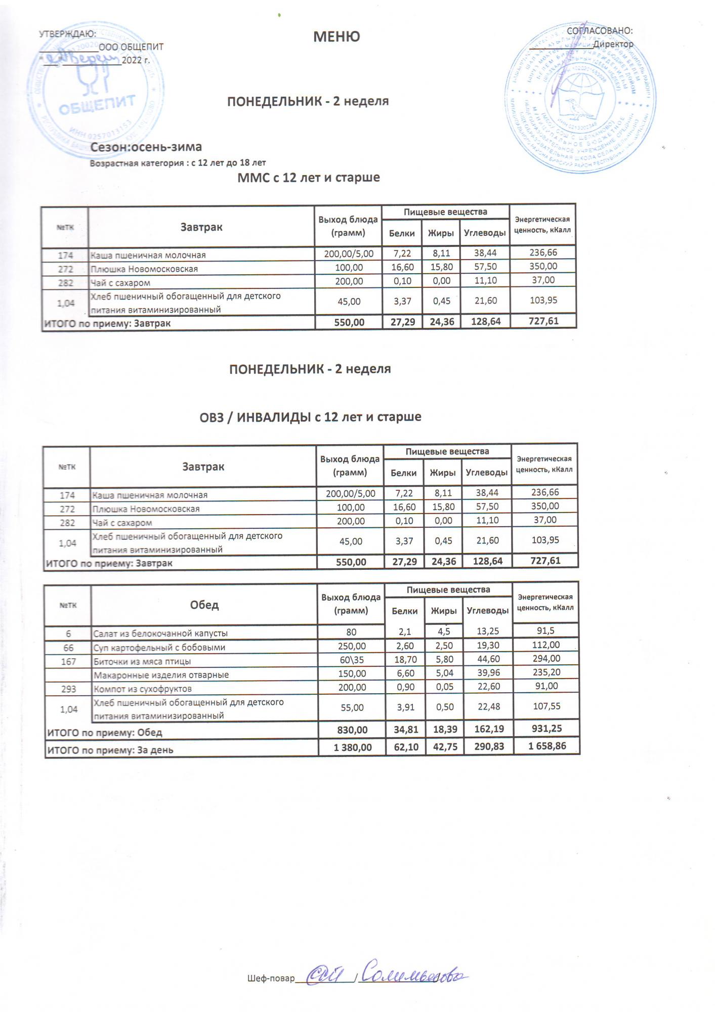 Двухнедельное меню за 2022-2023 учебный год(осень-зима)