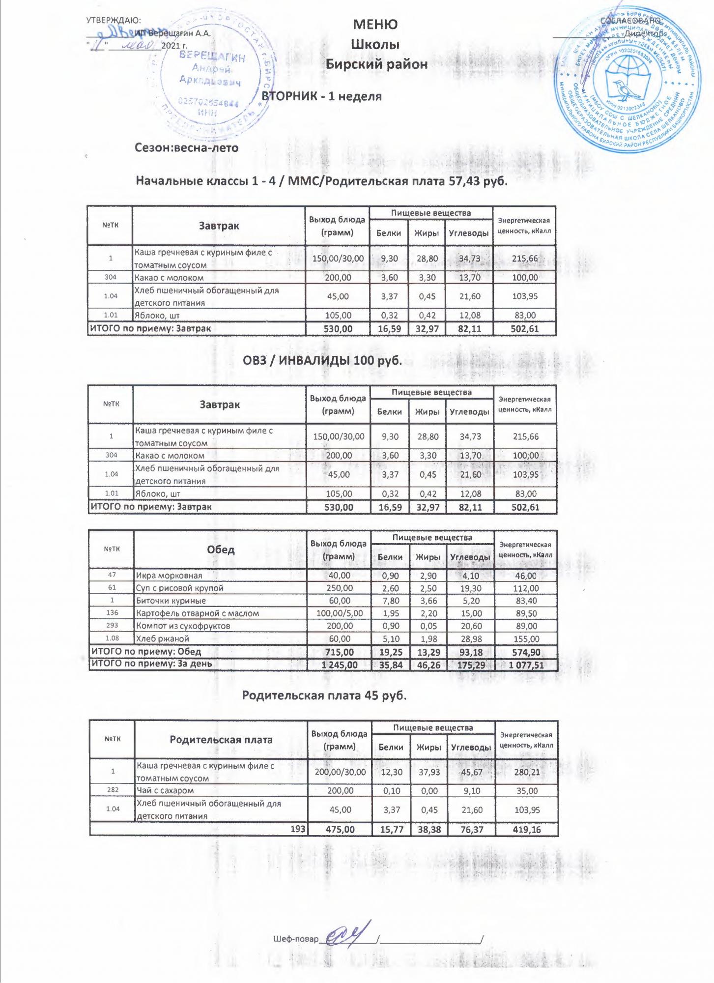 Об установлении стоимости горячего питания обучающихся в общеобразовательных организациях муниципального района Бирский район Республики Башкортостан с 01.01.2022