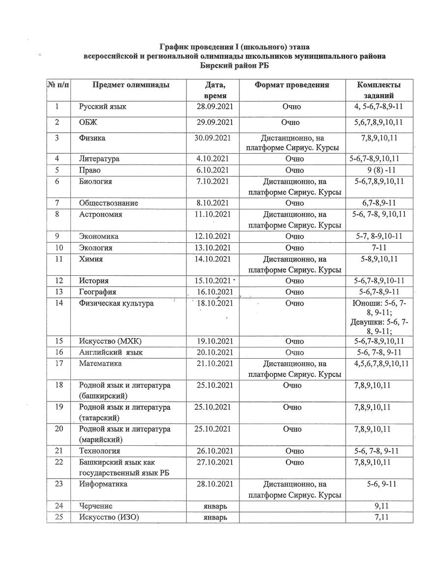 График проведения I (школьного) этапа всероссийской и региональной олимпиады школьников МР Бирский р-н РБ